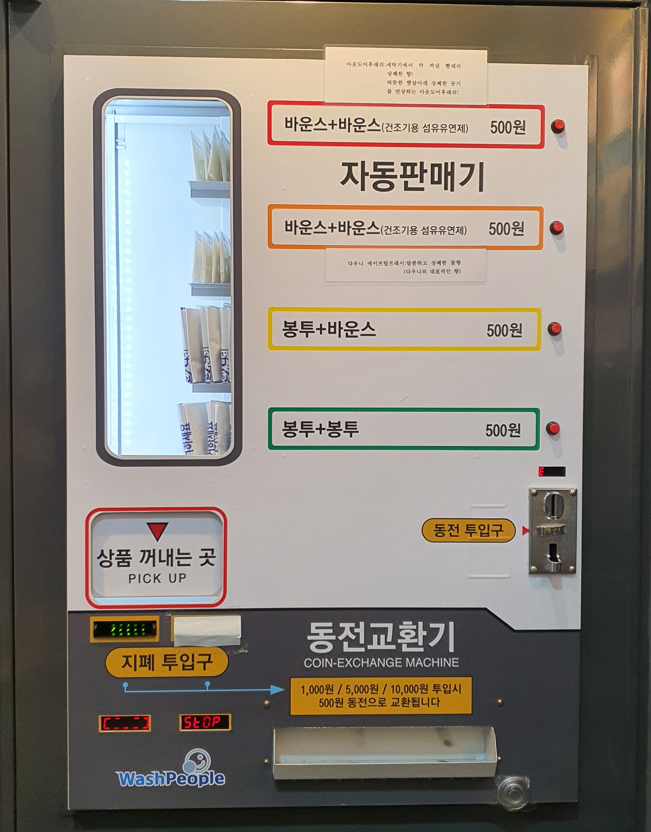 대신 섬유유연제는 포함되어있지않습니다. 섬유유연제 사용을 하시려면 가져가시거나 세탁방 안에 자판기가 있어서 여기서 구매하시면 돼요.