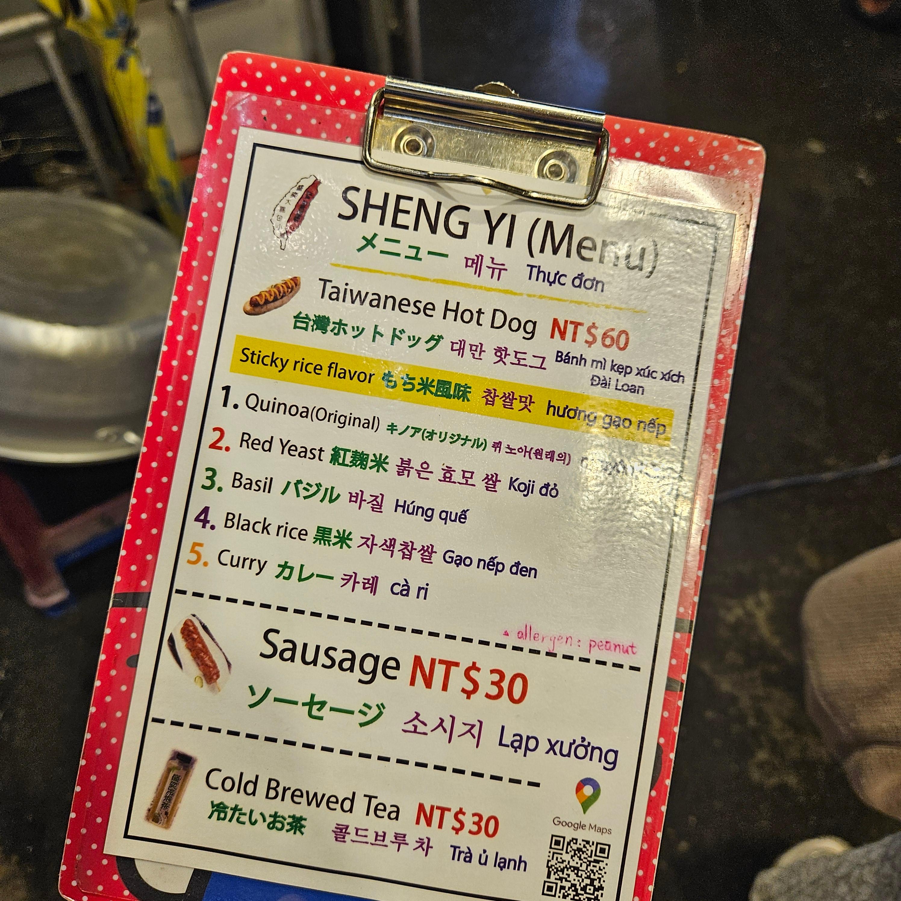 그리고 대만 찹쌀 핫도그를 먹었는데, 줄이 엄청 길었다. 그리고 유명한 건지 메뉴판도 글로벌하다.