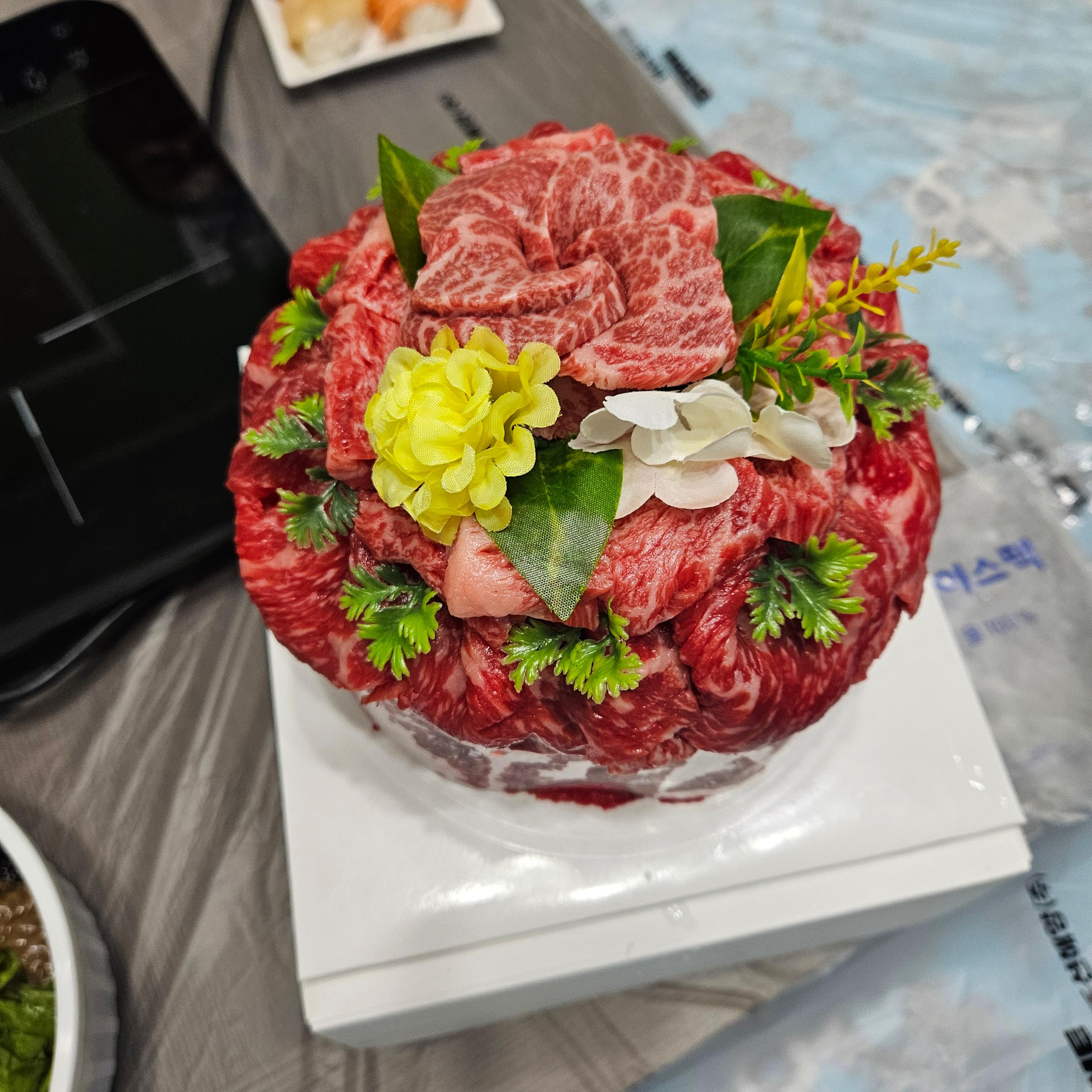 그리고 한우 케이크는 조화로 꾸며주셨어요. 조화 퀄리티가 좋지는 않았지만, 메인은 한우니까요.ㅋㅋㅋㅋㅋ