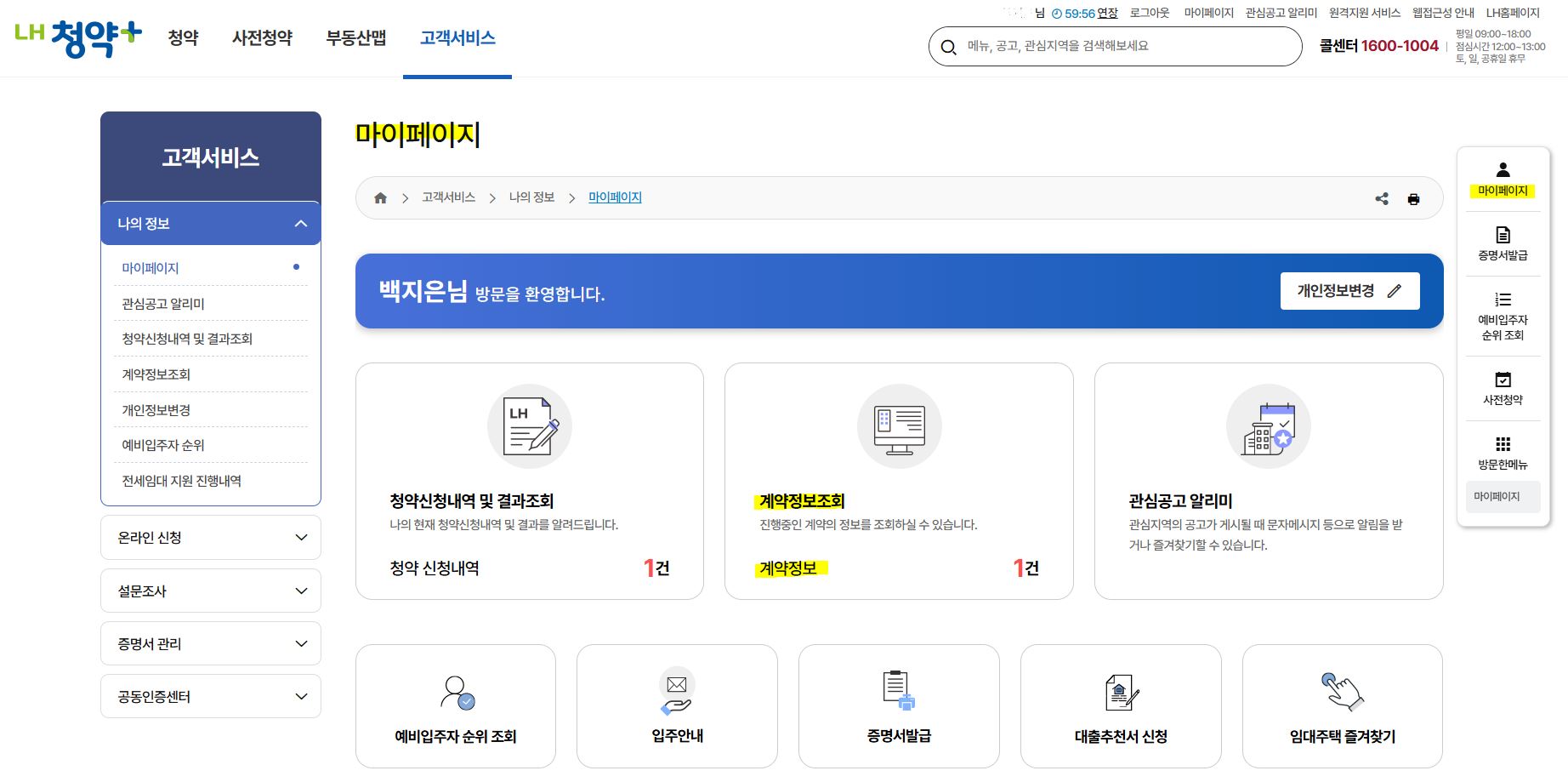 LH 청약 플러스 홈페이지에 로그인한 다음, 마이페이지에서 계약정보조회를 클릭한다.