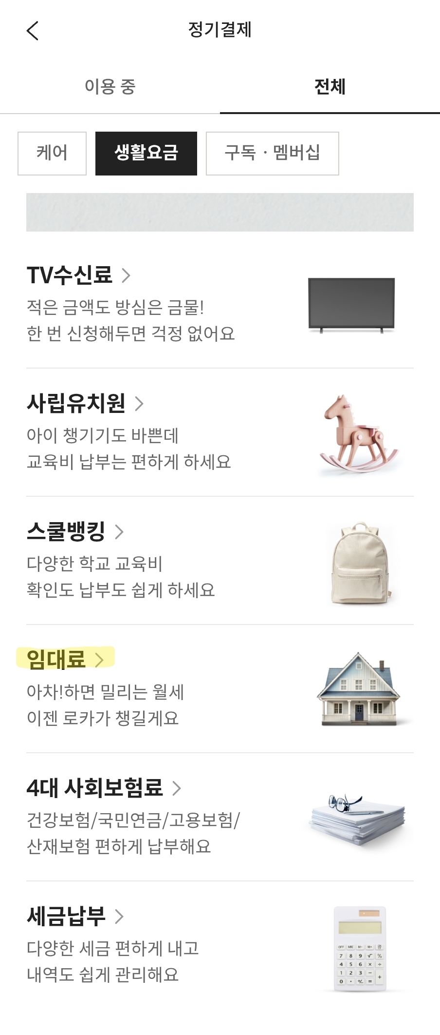 정기결제에는 임대료뿐만 아니라 TV수신료부터 교육비, 세금 등도 가능하다.