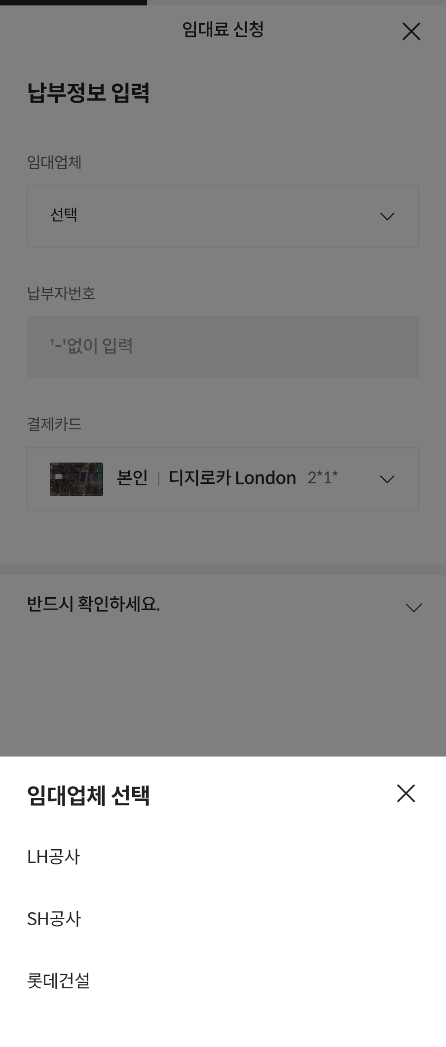 임대 업체를 LH공사, SH공사, 롯데건설 중에서 고르고, 납부자번호를 기입한다.