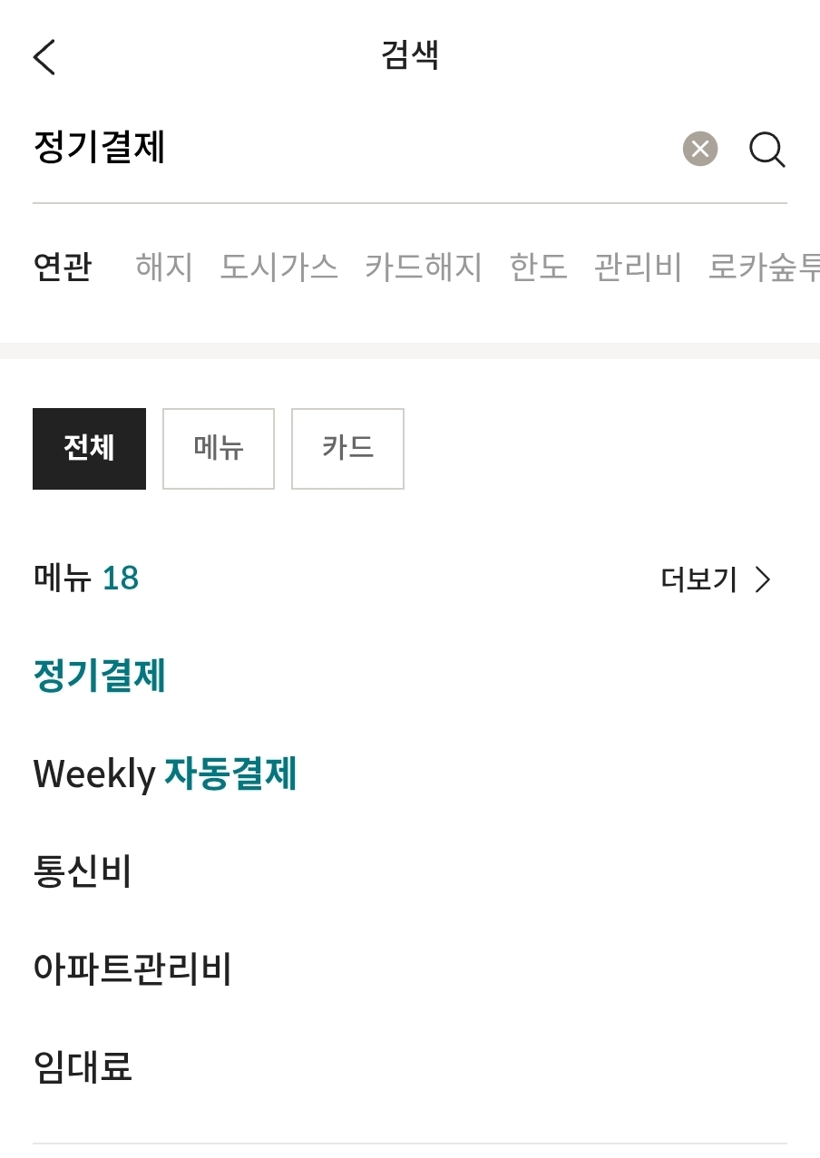 어플을 열어서 상단에 돋보기버튼을 눌러 검색창이 뜨면 정기결제를 검색한다.