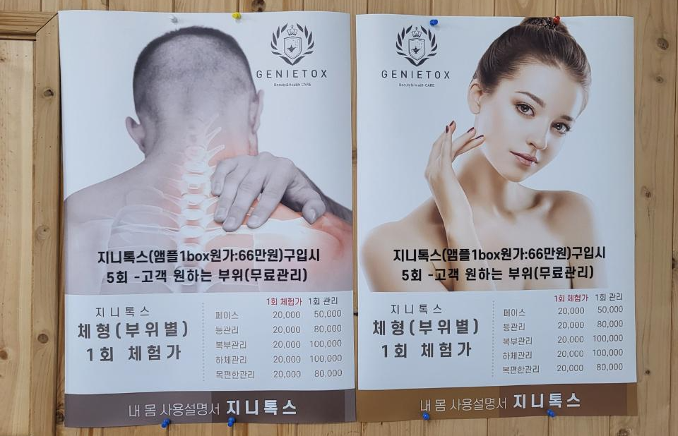 지니톡스는 근육 통증 완화 및 해독에 너무 좋다고 해요!! 지니톡스 전용 앰플이 있고, 전용기기가 있어요.