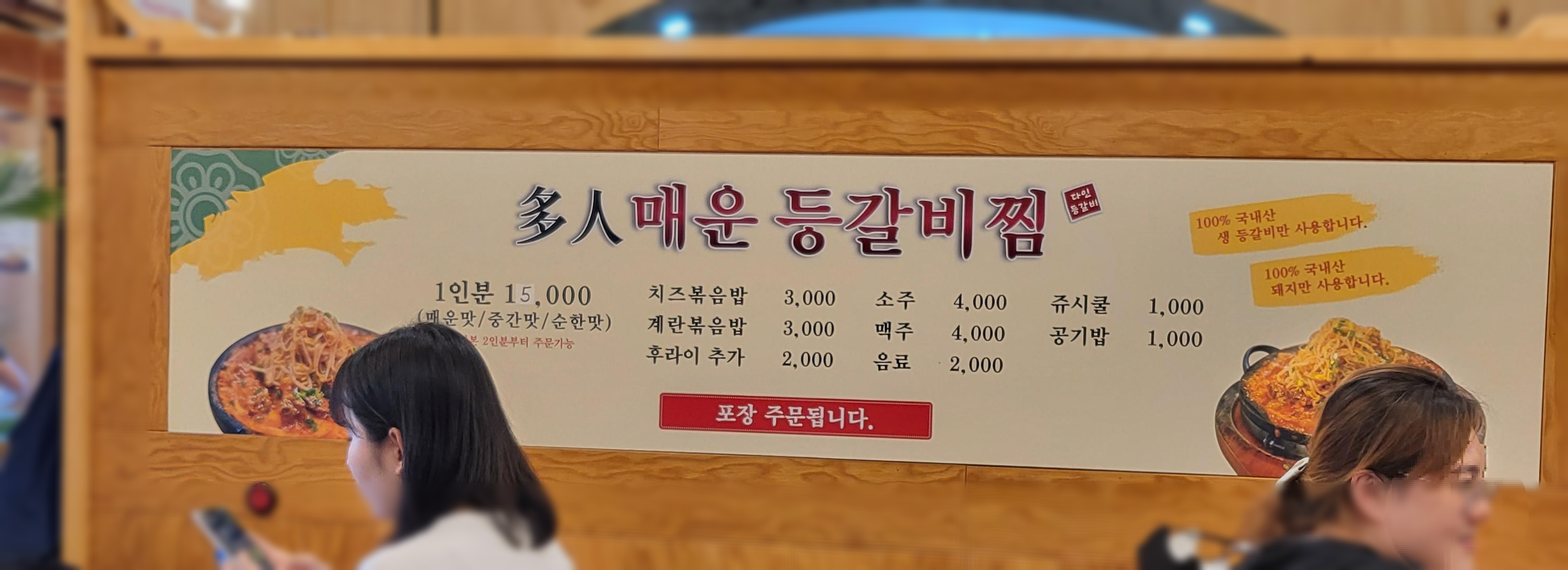 메뉴 : 매운 등갈비찜 (1인분, 15000원) 다인 삼겹살 (100g, 6000원) 치즈 볶음밥 (3000원)