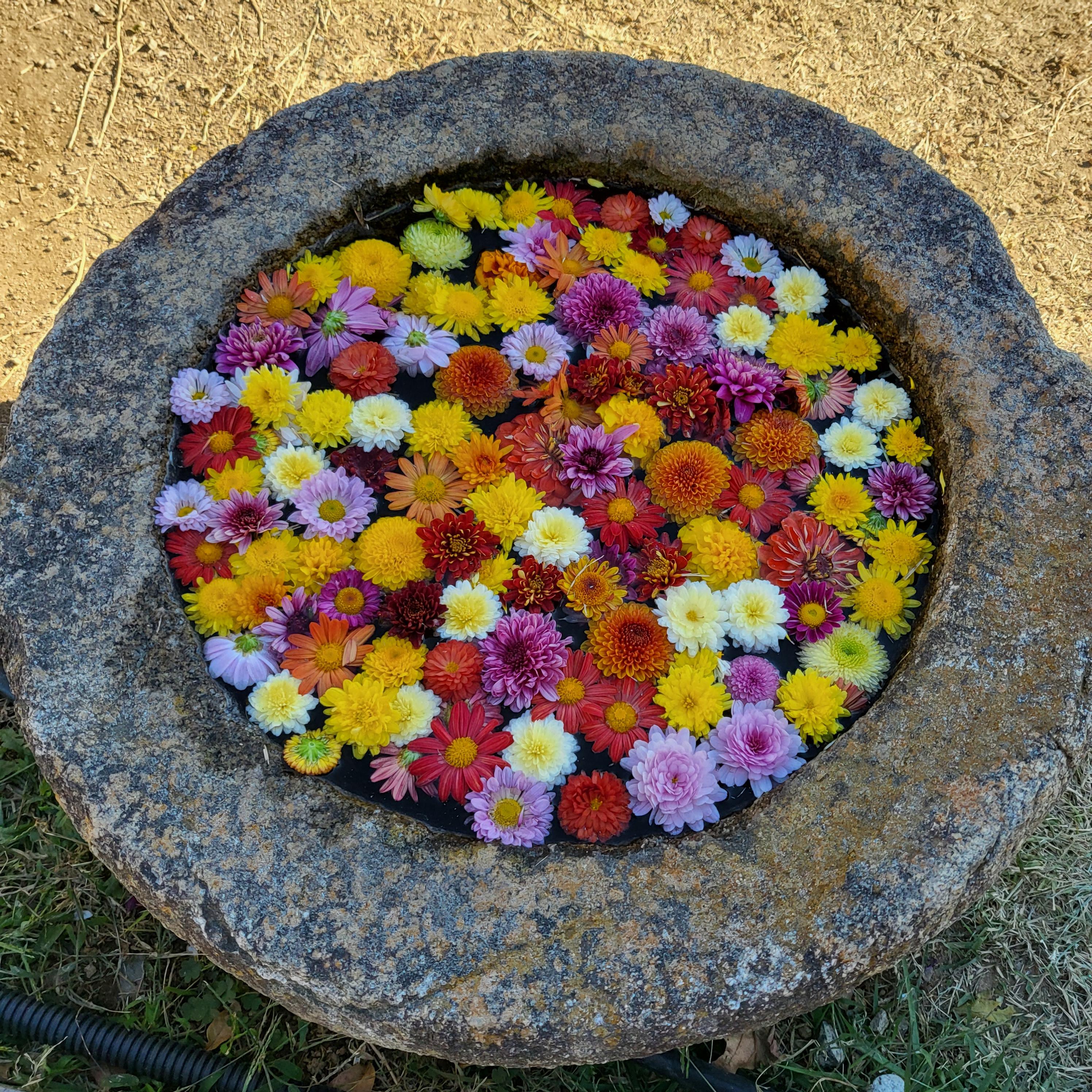 꽃 부분만 똑똑똑 따 가지고 물 위에 저렇게 딱 놓으니까 꽃들이 물 위에 떠서 너무 예쁘더라고요