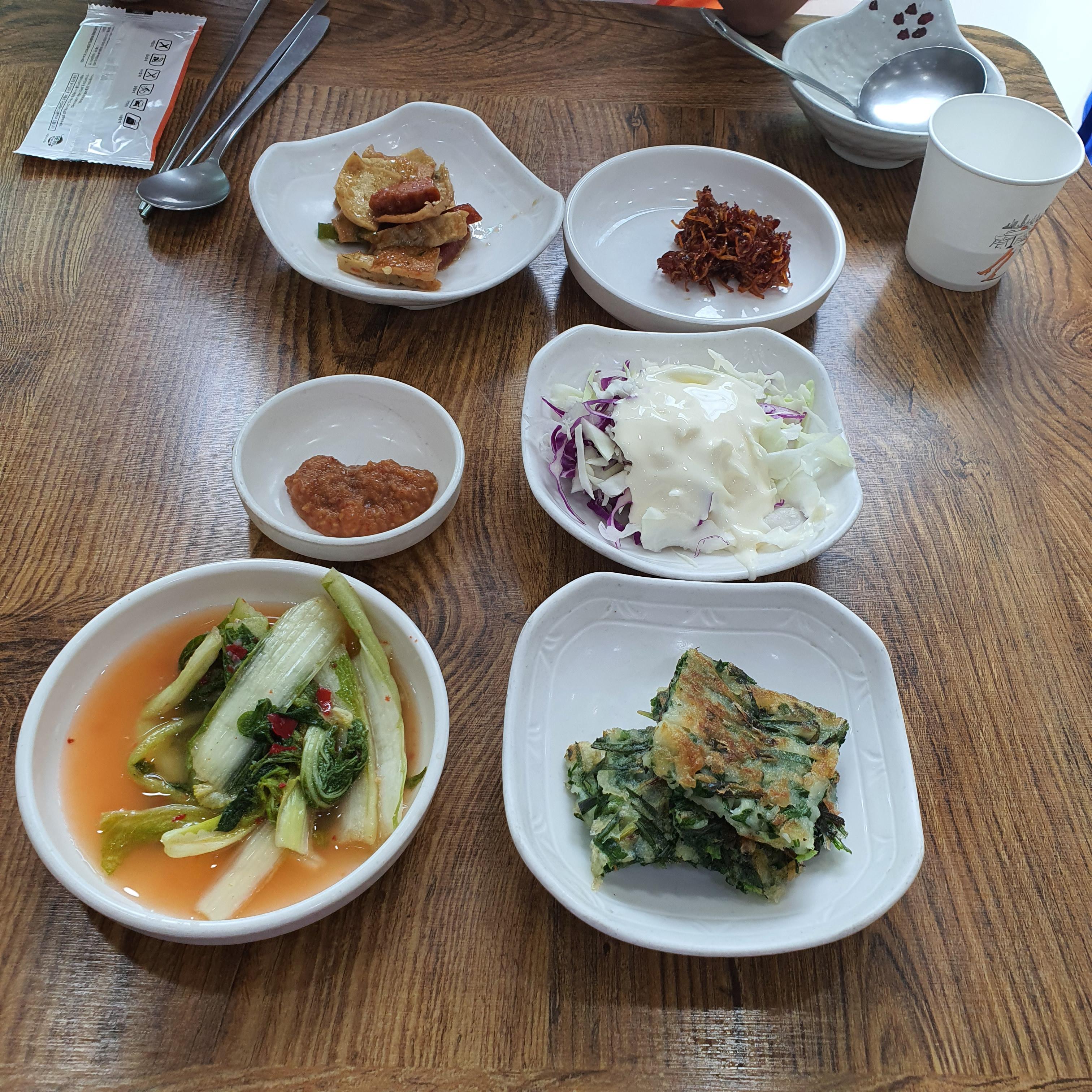 기본반찬은 살짝살짝씩 바뀌네요. 첫 번째 방문 때에는 어묵소시지볶음, 멸치볶음, 샐러드, 열무김치, 파전이 나왔고요, 두 번째 방문 때에는 어묵소시지볶음, 샐러드, 깍두기, 배추(?) 전, 생선껍질튀김이 나왔어요.