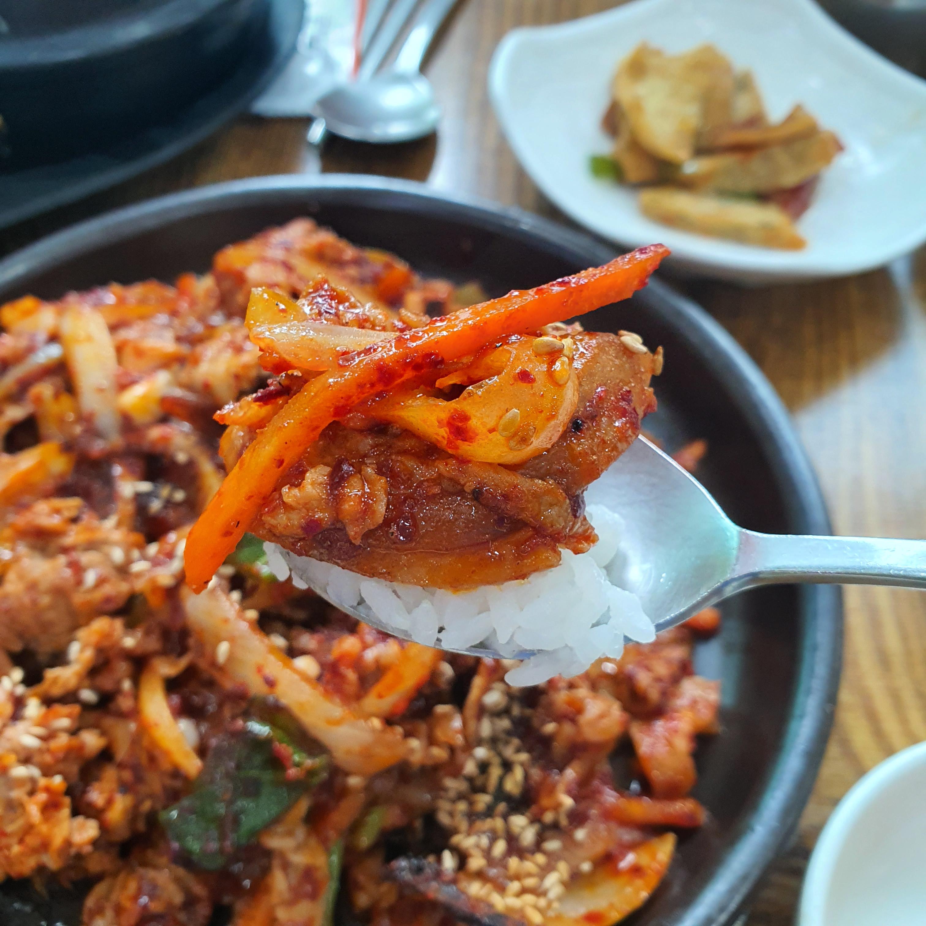 밥도 아주 꽉꽉 눌러 담아주신답니다. 그냥 밥 한 공기는 기본이고 밥 한 공기 더 시켜서 남은 양념에 싹싹 비벼 먹고 끝내야 해요. 반찬도 여러 가지라서 입이 오삼불고기, 제육에 질릴 틈이 없어요.