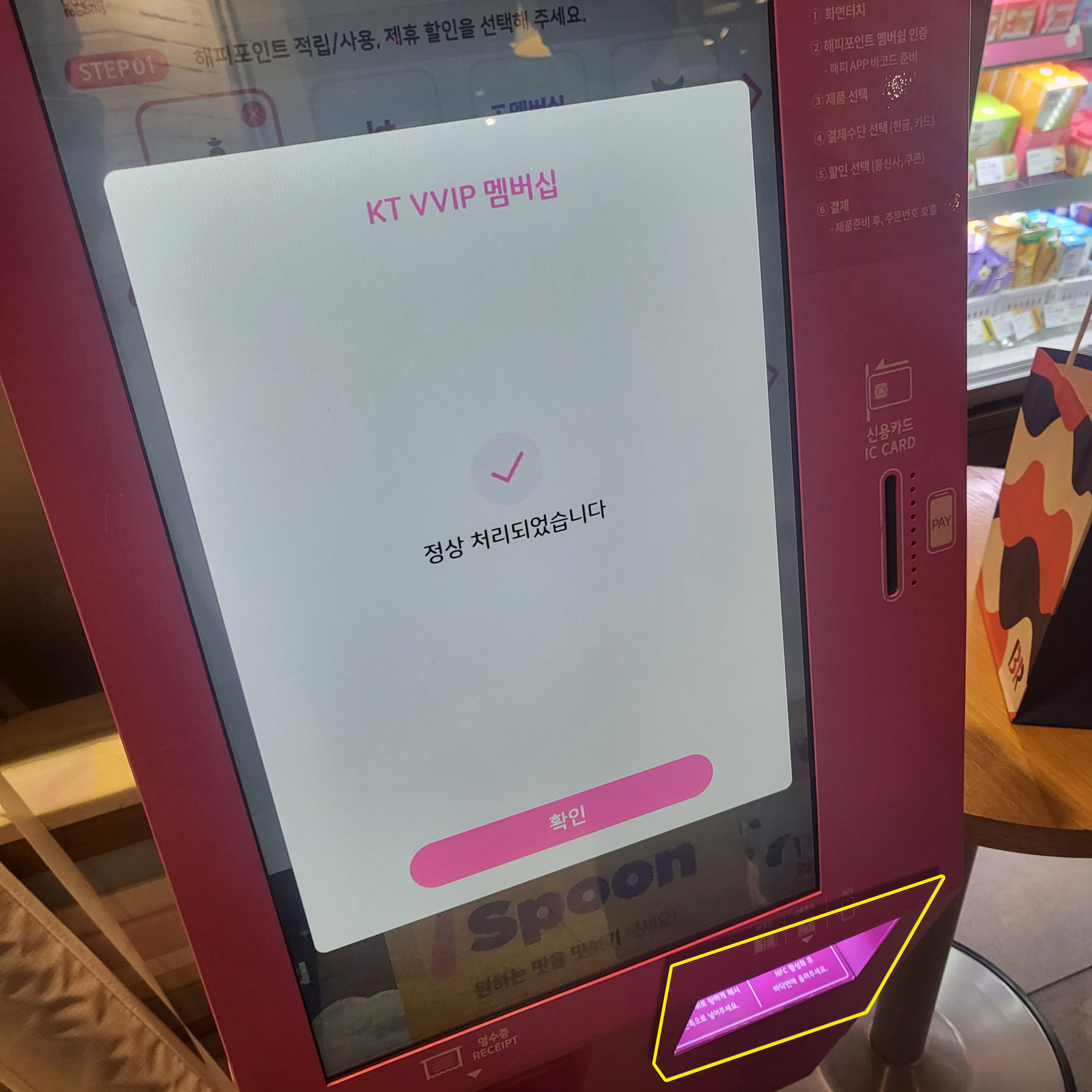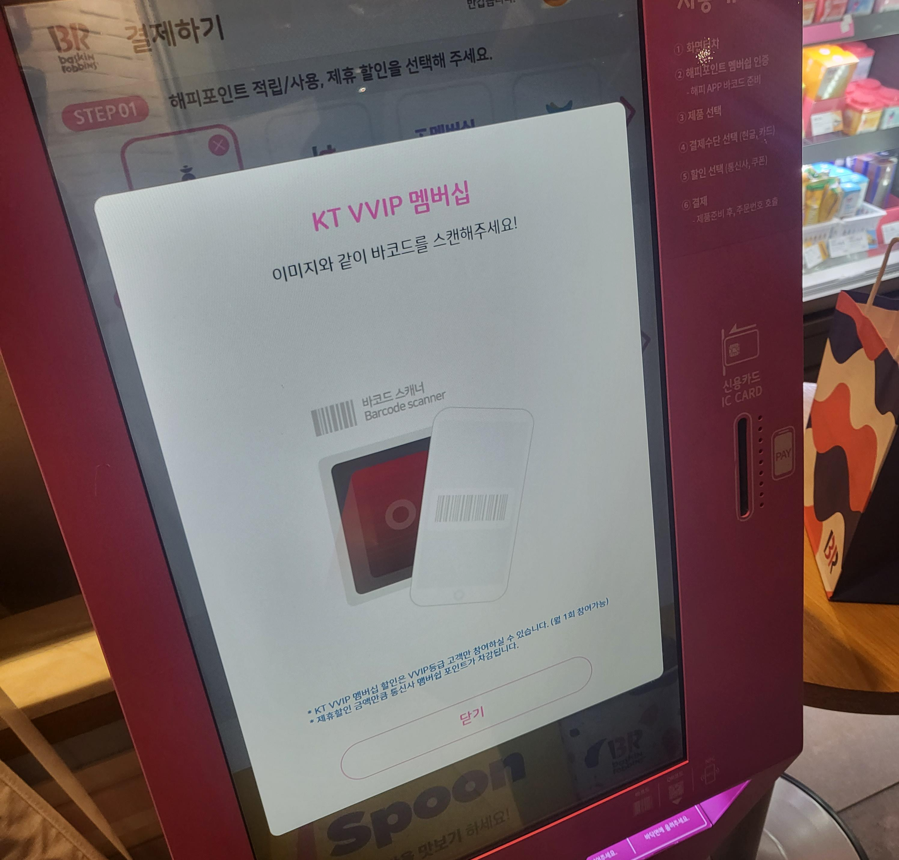 그럼 KT 멤버십 어플에서 바코드 화면을 띄우고, 키오스크 화면 아래에 바코드 확인하는 구멍이 있는데 거기에 폰 화면을 비춰주면 알아서 인식이 잘 되더라고요.