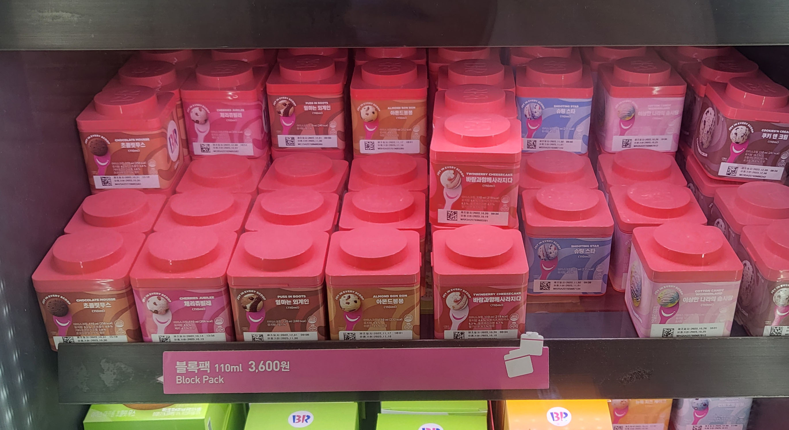 그러면 블록팩들이 보여요. 저는 처음에는 파인트 1 통보다 블록팩이 더 좋다고 생각했거든요? 왜냐면 블록팩은 각각 개별맛에 개별포장이잖아요. 그래서 더 좋은 줄 알았는데, 블록팩은 맛이 한정적이더라고요 ㅠㅠ 맛이 몇 가지 없네요.